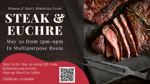 Women and Men’s Ministry Steak & Euchre Night. Join our Women’s and Men’s Ministry teams for a fun-filled Steak & Euchre Night on May 30 from 5–9pm in the Multipurpose Room. Enjoy a delicious steak dinner, friendly competition around the Euchre table, and plenty of laughter and fellowship along the way. Whether you’re a seasoned Euchre pro or just coming for the food and conversation, this night is for you! Childcare will be provided, so come ready to relax and connect. Please be sure to RSVP by May 26