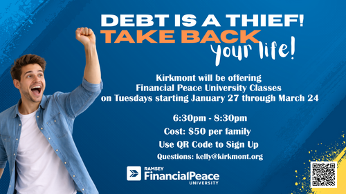 Financial Peace University. Debt is a thief! Has debt robbed your freedom and stolen your joy? Battle back! We’ll be using Dave Ramsey curriculum to teach you how to beat debt and build wealth with your income. Classes will be at Kirkmont on Tuesdays, starting January 27 and running through March 24th. Cost is $50.00 a family. We’ll meet in P6 from 6:30pm-8:30pm. Sign up using the link below. For questions, email: [email protected]