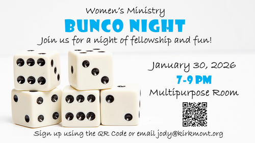 Join us for a Women’s Ministry Bunco Night on Friday, January 30, from 7:00–9:00 PM in the Multipurpose Room. Whether you’ve played Bunco before or it’s your first time, this will be a relaxed evening filled with laughter, fellowship, and connection with other women. Come enjoy some friendly competition, great conversation, and plenty of fun.
