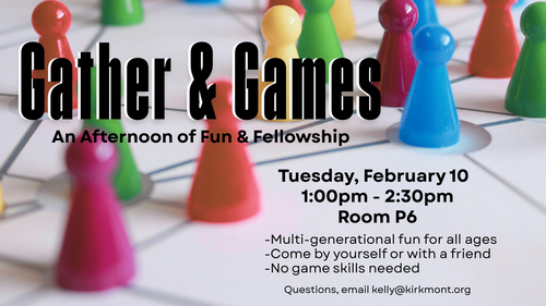 Gather & Games. February 10, 1:00-2:30pm, in P6. Come enjoy easy board games, good conversation, and time to connect with other members of the Kirkmont family. This is a relaxed, multi-generational gathering-everyone is welcome, no matter your age or stage in life. Email [email protected] with questions.